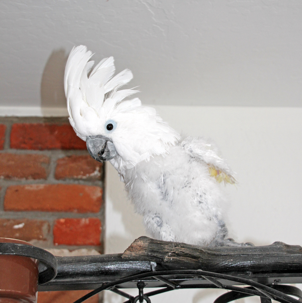 There are over 40 types of Cockatoos, 12 of which are white. Chantilly is either an exceptionally small Umbrella Cockatoo (My neighbors swear her original owners sold her as an Umbrella), or a Blue Eyed Cockatoo. Both descriptions of the bird types fit her appearance, though she is very small for an Umbrella, and the skin around her eyes are not very "bright" blue for a Blue Eyed. She does have yellow on the under parts of her crest feathers which could be indicative of a Sulphur Crested Cockatoo. It's hard to say for sure just yet as most of the feathers that would identify her breed are chewed off. It's just that she is so small for an Umbrella that we question what type she is. Side note: Barretta's famous bird was an Umbrella Cockatoo. This picture is included in the It is not only fine feathers that make fine birds - Chantilly Lace photo album belonging to Badger. It has been uploaded on 29 Jan 2014 at 10:49PM. Votes: 3 You can return to Badger's album or open your photo album. Comments Re: Showing off her crest maybe the female blue eyes aren't as deep blue as the male?