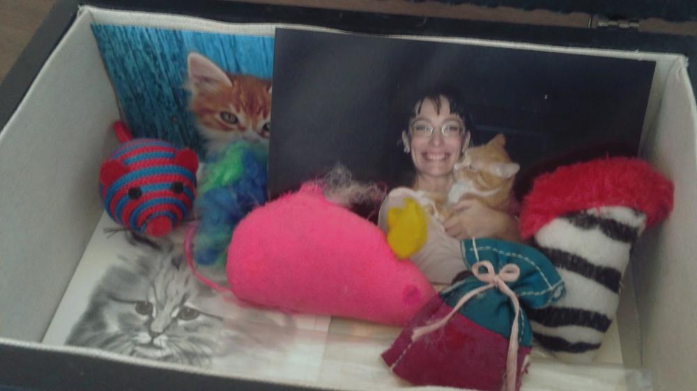 Some of her favorite toys, my favorite picture of us, and the card my Mom sent in condolence. The card our vet sent us is underneath on the right side, too, plus a little snack sized baggy with some of her little fur balls in it! Soon to be added to the collection: her golden colored crown shaped charm that I put on her harness. A friend got that for her because her name means QUEEN in Hebrew! (Malkah!) I'm going to re-attach some of the rhinestones that came off, then it'll be in there, too!
