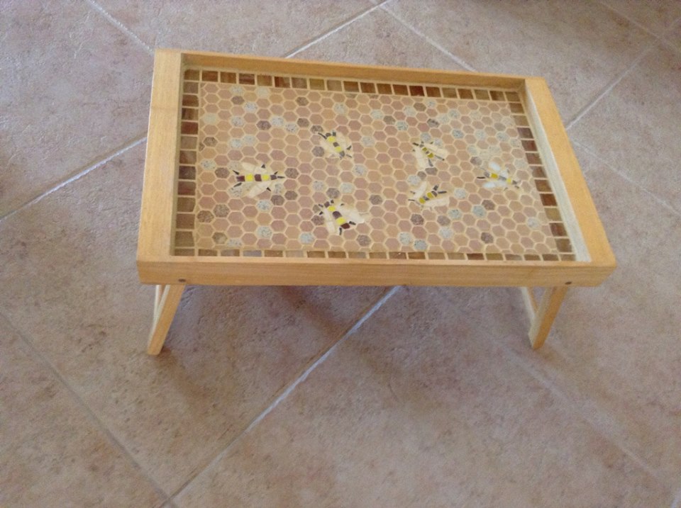 In the sale, in Cyprus, was this table, all in wood. So I mosaiced it into a "honeycomb"! As the tiles were square, I had to cut them into a six sided piece to look like a honeycombe.