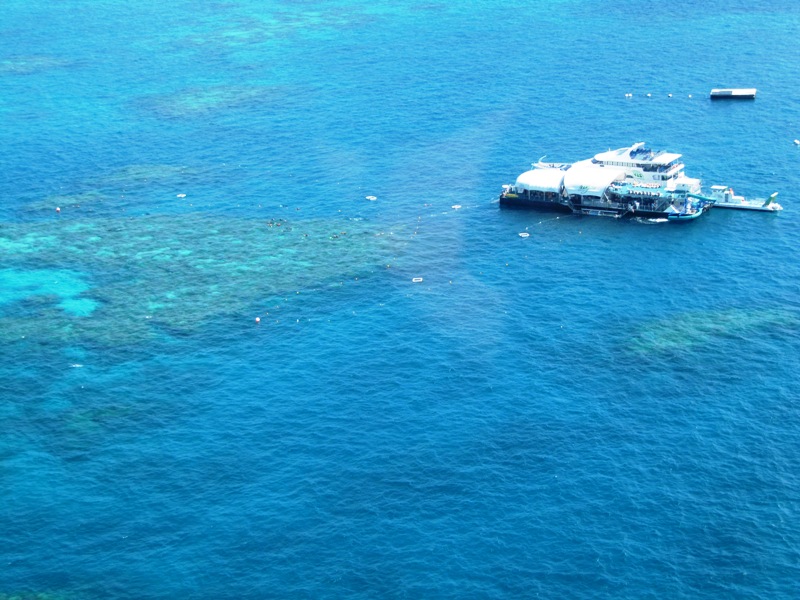 This picture was take in September 2010 on a helicopter joy flight over the berrier reef. This is the pontoon and ship that was home for the day. the ropes in the water was where could snorkle too.