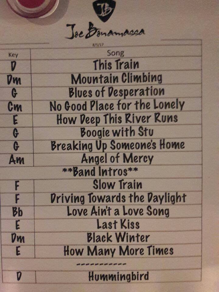 This picture is included in the BONAMASSA CONCERTS photo album belonging to Abby Normal. It has been uploaded on 8 Aug 2017 at 12:09AM. Votes: 1 You can return to Abby Normal's album or open your photo album. Comments Re: VA BEACH 8/5/17 - SET LIST I FOUND THE JOE BONAMASSA THIS TRAIN VIDEO FOR YOU!https://www.youtube.com/watch?v=oCxRYvVN0CAPosted at 12 Aug 2017 at 7:07AM by PEACH WINE Re: VA BEACH 8/5/17 - SET LIST Thank you! But to be honest, there's nothing Joe has done that I don't have or have seen. I'm anxiously awaiting his new album!!!!!